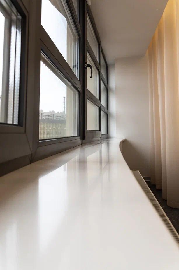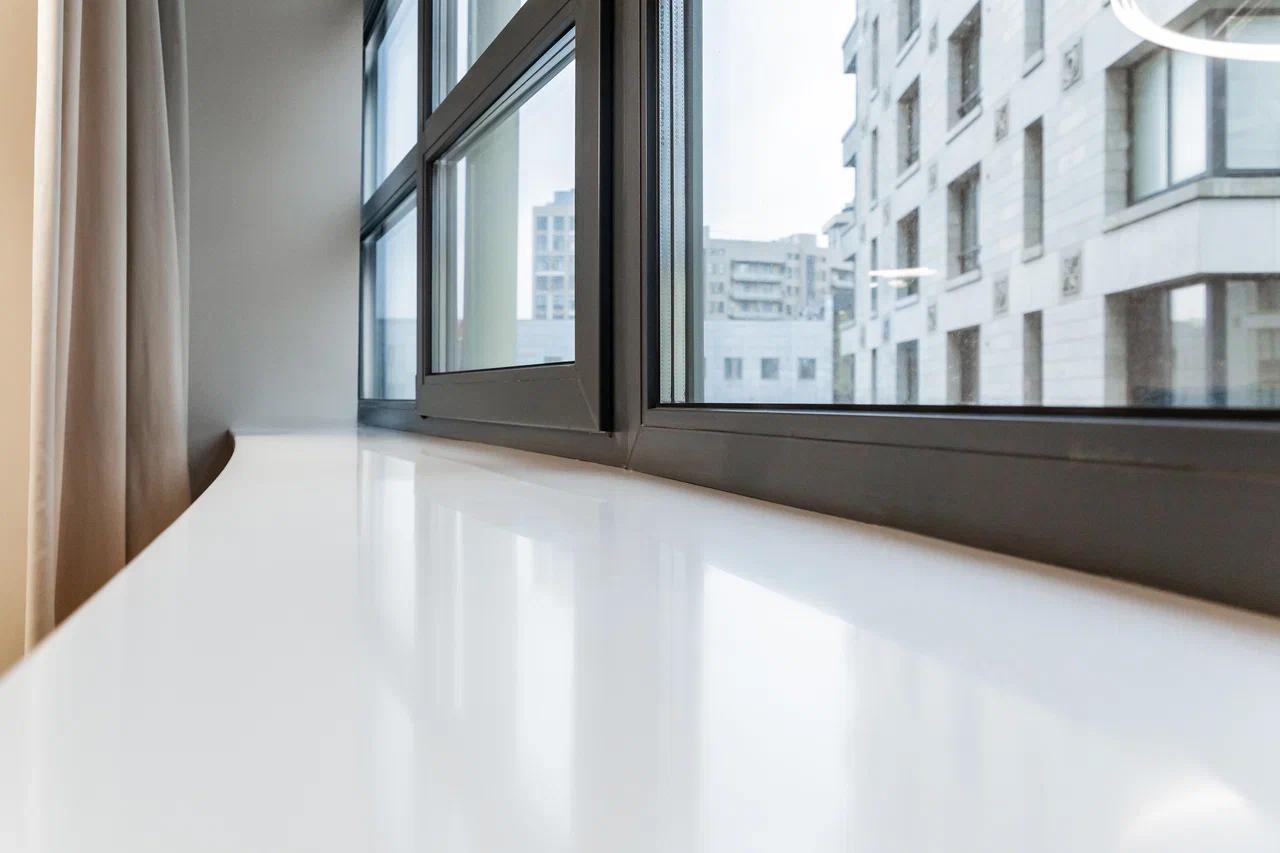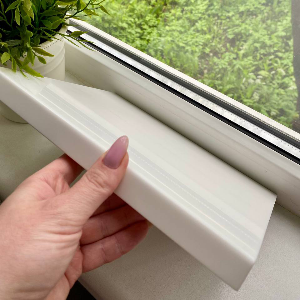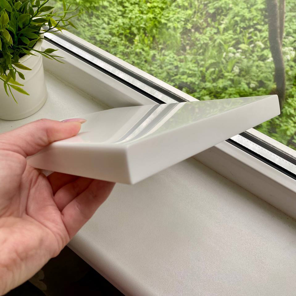 Подоконник аккуратный, тонкий, идеально ровный, выглядит современно и дорого. Поверхность приятная на ощупь, тёплая, легко ухаживать.